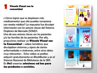 El documento describe varias estrategias de comunicación y capacitación implementadas por la empresa Palabra en Blanco para diferentes clientes con el objetivo de aumentar las ventas de medicamentos, mejorar la atención al cliente, y promover cambios organizacionales. Las tácticas incluyeron videos educativos, entrenamientos virtuales interactivos, programas de radio, manuales de capacitación y campañas publicitarias.