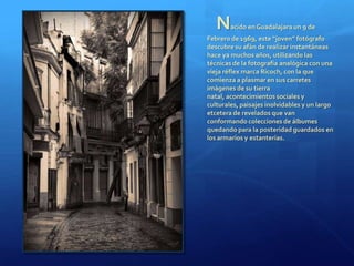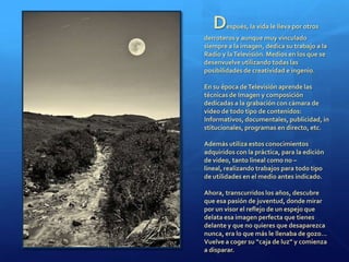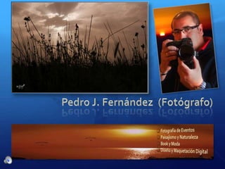 Este documento presenta una diapositiva de presentación de un fotógrafo profesional que ofrece sus servicios en diferentes categorías como campeonatos deportivos, eventos religiosos, retratos, paisajes y maquetación digital. Incluye recuadros con enlaces a muestras de su trabajo y datos de contacto.