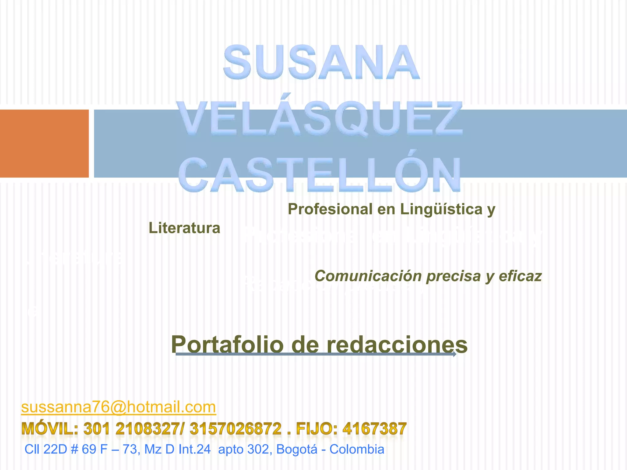 Susana Velásquez Castellón es una profesional en lingüística y literatura que se especializa en redacción precisa y eficaz, destacando la importancia de una comunicación clara para alcanzar objetivos. Su portafolio incluye diversos textos y actividades educativas, y su trabajo en el área también abarca la redacción de artículos sobre viajes y calidad del café. Además, presenta conceptos avanzados de escritura y lleva a cabo estudios de factibilidad para programas educativos en el sector hotelero.