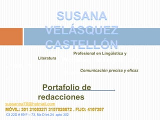 Susana Velásquez ofrece servicios de redacción precisa y eficaz. Es profesional en lingüística y literatura con experiencia en la redacción de documentos, artículos y portafolios. Proporciona resúmenes, correcciones y otros servicios de comunicación estratégica para ayudar a los clientes a lograr sus objetivos de manera clara y directa.