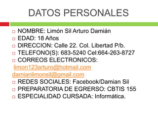 Este documento presenta la información personal y académica de Limón Sil Arturo Damián, un estudiante de 18 años que cursa la carrera de Tecnologías de la Información y Comunicaciones en el Instituto Tecnológico de Tijuana. El documento incluye sus datos personales, intereses, proyectos de vida profesional y personal, expectativas sobre el curso y el docente, y un compromiso para esforzarse por aprobar el curso propedéutico.