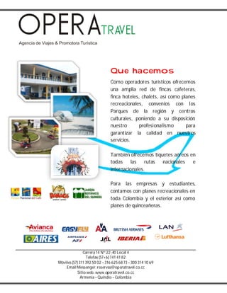 Opera Travel es una agencia de viajes y operador turístico colombiano con sede en Armenia, Quindío que ofrece servicios como alojamiento, paquetes turísticos, transporte aéreo y terrestre, tarjetas de asistencia al viajero, y eventos. Su misión es satisfacer las expectativas de sus clientes con calidad en materia de recreación, descanso y cultura.