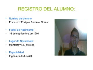 Este documento presenta información sobre Francisco Enrique Romero Flores, un estudiante de ingeniería industrial. Incluye detalles sobre su registro académico, su perfil personal, sus expectativas de la universidad y el curso, y descripciones breves de actividades en clase como trabajar en equipos y recomendaciones para mejorar.