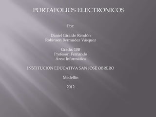 Este documento describe lo que es un portafolio electrónico, que es una recopilación de trabajos de un estudiante en formato digital que puede incluir texto, gráficos, videos u otros medios. Explica que sirve para que los estudiantes guarden sus logros y reciban comentarios, y que cada portafolio es único debido a las experiencias personales de cada estudiante. Además, detalla cómo los profesores y estudiantes pueden acceder a sus propios portafolios electrónicos asignados por la escuela.