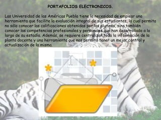 El documento habla sobre los portafolios electrónicos. Explica que son una herramienta en línea que permite a estudiantes y profesores almacenar evidencia de sus logros y trabajo. Los estudiantes pueden mostrar su aprendizaje y ejemplos de trabajo, mientras que los profesores pueden compartir métodos de enseñanza. El documento también provee instrucciones sobre cómo obtener un portafolio electrónico y quién puede acceder la información contenida.