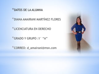 Este documento presenta un resumen de las actividades realizadas por Diana Amairani Martínez Flores como parte de su curso de Licenciatura en Derecho. Incluye información personal, objetivos del curso y la profesora, así como una serie de actividades relacionadas con el uso de las TIC como la creación de un blog, comentarios sobre tecnología, búsqueda de información y una conclusión sobre comunicación.