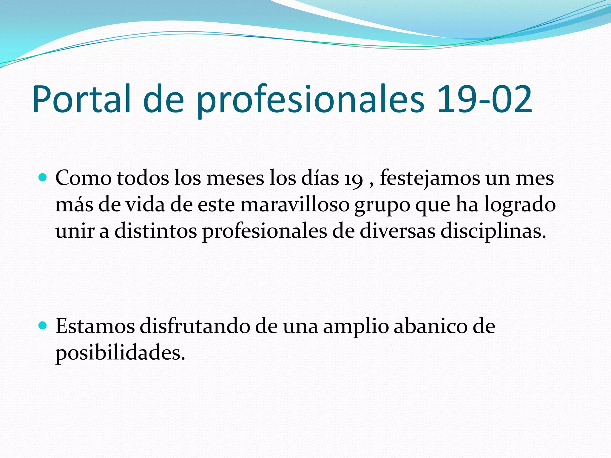 Este documento celebra el aniversario de un grupo de profesionales de diversas disciplinas que se han unido. El grupo ofrece una variedad de posibilidades como una consultora intercultural, un área de integración y una revista multidisciplinaria. Los valores fundamentales del grupo incluyen la pasión por las personas, la responsabilidad, el compromiso, la lealtad y la integración cultural. El documento felicita al grupo por su trabajo y da la bienvenida a nuevos profesionales.