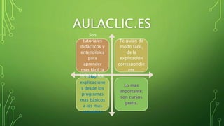 Este documento describe dos portales educativos en línea, Aulaclic.es y Aulafacil.com. Aulaclic.es ofrece tutoriales didácticos y gratuitos para aprender programas informáticos como Excel, PowerPoint, Word y Photoshop de manera fácil. Aulafacil.com no solo cubre temas de tecnología, sino una variedad de otros temas como idiomas, cocina y deportes, a través de cursos en línea gratuitos y entretenidos.