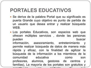1) Los portales educativos son sitios web que ofrecen múltiples servicios a la comunidad educativa como profesores, estudiantes y familias, incluyendo información, recursos educativos y herramientas de comunicación.