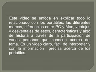 Este video explica las diferencias entre portátiles PC y Mac, incluyendo sus ventajas y desventajas. Los portátiles PC tienen un bajo precio, variedad de diseños y sistemas operativos, pero requieren actualizaciones frecuentes y tienen menos seguridad. Los portátiles Mac son más seguros, rápidos y potentes, pero tienen un precio más alto, menos variedad y conectividad limitada. El video también brinda información sobre la historia y uso de los portátiles.