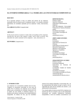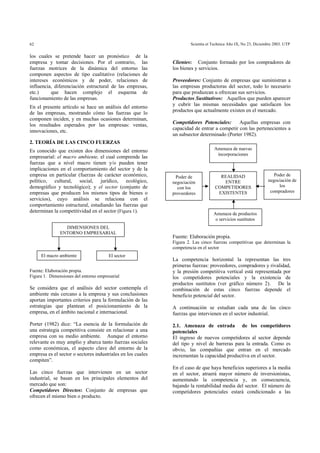 El documento analiza la teoría de las cinco fuerzas competitivas de Michael Porter para evaluar el entorno empresarial. Explica que las cinco fuerzas que determinan la competencia en un sector son: la amenaza de nuevos competidores, la rivalidad entre competidores existentes, la amenaza de productos sustitutos, el poder de negociación de los clientes, y el poder de negociación de los proveedores. El documento analiza cada una de estas fuerzas y los factores que las componen.