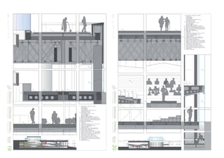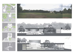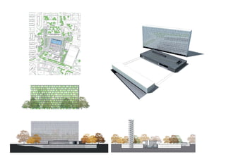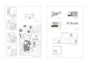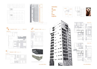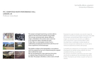 The document contains profiles of architecture projects designed by Luis Lavilla Olleros including a performance hall in Hampstead Heath, London, a housing complex in Vitoria, Spain, and renovations to a church in London. It also includes profiles of studio projects such as a residential tower in Logroño, Spain and drawings analyzing the work of famous architects like Tadao Ando, Jesus Bazal, and Alvaro Siza.