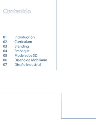 Este portafolio presenta los trabajos de diseño gráfico, industrial, de empaque y mobiliario de Jose Damian Valdez para demostrar sus habilidades. Incluye detalles personales, experiencia laboral, formación académica, proyectos destacados de diseño de empaque, modelado 3D, diseño de mobiliario y diseño industrial.