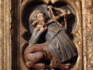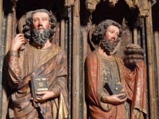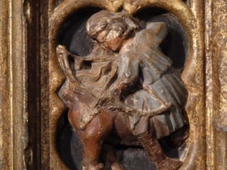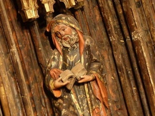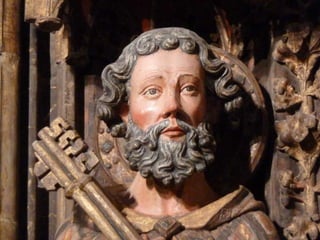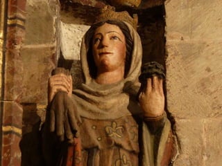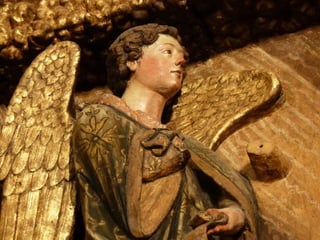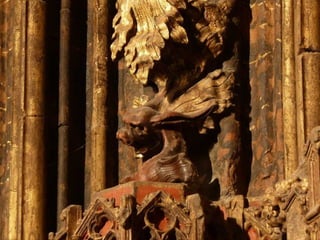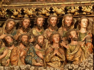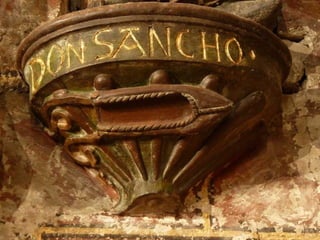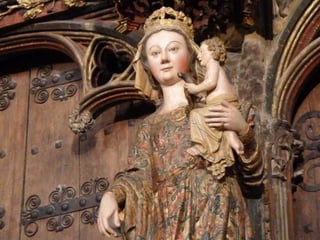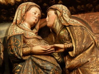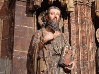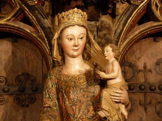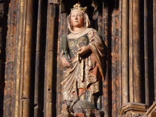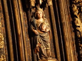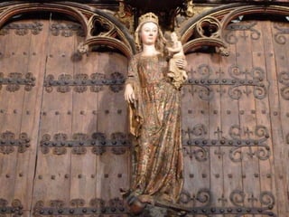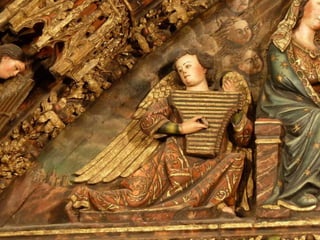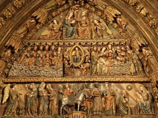 El pórtico de Santa María en Laguardia, Álava es uno de los mejores templos góticos de España debido a su portada policromada del siglo XVII que representa escenas de la vida de la Virgen María, incluyendo la Anunciación, Visitación y Coronación, además de estatuas de ángeles, santos y los doce Apóstoles.