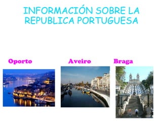 Portugal es una república ubicada en el extremo sudoeste de Europa. Su capital es Lisboa y otras ciudades importantes incluyen Oporto, Aveiro y Braga. La gastronomía, música, literatura, arquitectura, cine, pintura y deportes son parte integral de la cultura portuguesa.