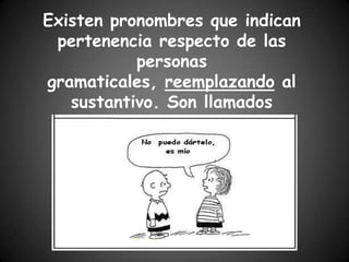 Este documento explica los posesivos en español. Indica que existen pronombres y adjetivos posesivos. Los pronombres posesivos reemplazan al sustantivo, mientras que los adjetivos posesivos lo acompañan. Luego presenta una tabla con las formas de los posesivos según la persona y número.