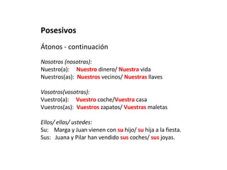 Este documento explica los posesivos en español. Presenta dos tipos de posesivos: átonos y tónicos. Los posesivos átonos van delante de un sustantivo y varían según el poseedor (yo, tú, él, nosotros, etc.). Los posesivos tónicos pueden ir solos o después de un sustantivo, y también varían según el poseedor. Incluye cuadros que resumen las formas de los posesivos para un solo objeto o varios objetos poseídos, según el poseedor.