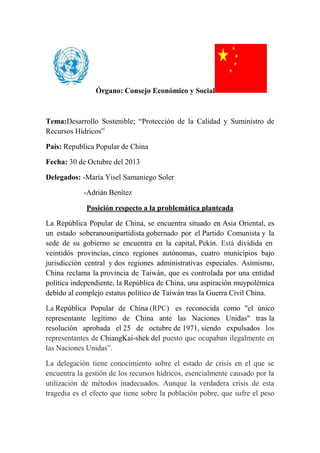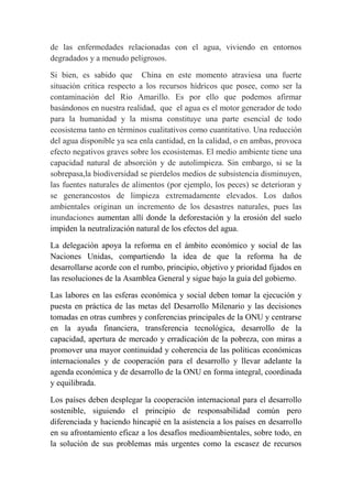 La delegación de China expresa su preocupación por la crisis de los recursos hídricos en China, especialmente la contaminación del Río Amarillo. China propone cinco puntos para promover el desarrollo sostenible y proteger los recursos hídricos, incluyendo aumentar la concienciación sobre la importancia del agua y apoyar a los países en desarrollo a hacer frente a los retos ambientales. China también enfatiza la necesidad de considerar las diferencias entre países desarrollados y en desarrollo al formular políticas sobre cambio climático y energ