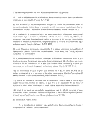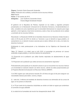 La República de Polonia presentó ante la Comisión sobre Desarrollo Sostenible un documento en el que expresa su profunda preocupación por la situación actual de los recursos hídricos mundiales y propone cinco puntos para mejorar su protección y suministro. Entre las propuestas se incluyen ratificar las metas de los Objetivos de Desarrollo del Milenio relacionadas con el agua, crear objetivos regionales a corto plazo, fomentar la cooperación internacional y la investigación de nuevas tecnologías para un uso s