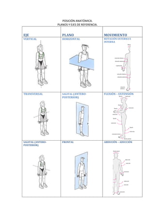 El documento describe los planos y ejes de referencia anatómicos que se utilizan para estudiar la disposición de los segmentos del cuerpo y los movimientos entre ellos. Explica que existen tres ejes principales - vertical, transversal y sagital - que definen tres planos y tipos de movimiento. El eje vertical y plano horizontal definen la rotación, el eje transversal y plano sagital definen la flexión y extensión, y el eje sagital y plano frontal definen la abducción y aducción.