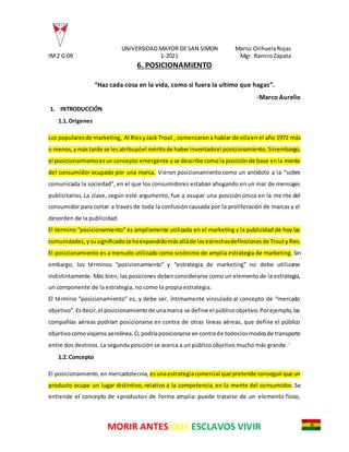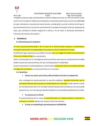 El documento discute el concepto de posicionamiento en marketing. Explica que el posicionamiento se refiere a la posición ocupada por una marca en la mente de los consumidores. Describe diferentes estrategias de posicionamiento como basarse en atributos, beneficios o uso del producto. También analiza elementos que componen un buen posicionamiento, beneficios del posicionamiento, y errores comunes de posicionamiento. El documento concluye enfatizando la importancia del posicionamiento para las empresas en la sociedad actual sobrecomunicada.