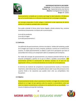 El posicionamiento en mercadotecnia es una estrategia que busca asegurar un lugar distintivo para un producto en la mente del consumidor en relación a la competencia. Este concepto se basa en la percepción del consumidor y está vinculado a la propuesta de valor, permitiendo a las empresas evaluar la imagen que proyectan y ajustar sus estrategias de marketing. Existen diversos tipos de posicionamiento, incluyendo por beneficios, competencia, y atributos, los cuales ayudan a diferenciar un producto y a maximizar su atractivo en el mercado.
