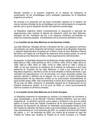 La posición argentina sobre las Islas Malvinas, Georgias del Sur y Sandwich del Sur es que forman parte integral de su territorio nacional. Argentina mantiene una disputa de soberanía sobre estos territorios con el Reino Unido y busca resolverla a través de negociaciones de acuerdo con las resoluciones de Naciones Unidas. Sin embargo, el Reino Unido se ha negado a negociar y ha llevado a cabo actividades unilaterales como la exploración de hidrocarburos en la plataforma continental argentina bajo su ilegítima o