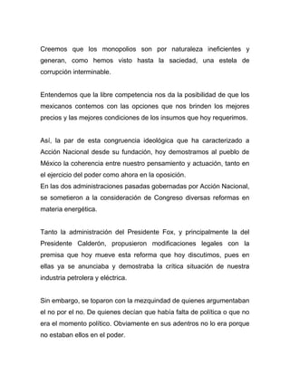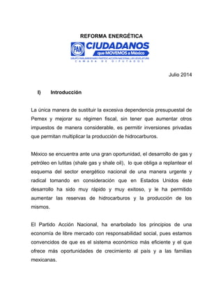 Esta reforma energética permitirá la inversión privada en el sector energético de México para aumentar la producción de hidrocarburos, crear empleos, y mejorar la situación financiera de Pemex. El documento también propone abrir la competencia en los mercados de gas y electricidad para mejorar la eficiencia, reducir costos para los consumidores, y fomentar las energías renovables. El PAN apoya esta reforma para consolidar la soberanía energética de México y atraer inversiones, a la vez que se mantienen la propiedad