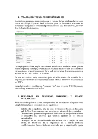 Este documento presenta una estrategia de posicionamiento SEO para la empresa Vinos Uclés. Actualmente la página web de la empresa no aparece en los primeros resultados de búsquedas por las palabras clave "comprar vino", debido a la alta competencia. Se propone una estrategia para mejorar el posicionamiento que incluye aumentar los enlaces entrantes de calidad para subir el PageRank, ofrecer contenidos interesantes para generar más enlaces, y optimizar las palabras clave y el código de la página para mejorar los resultados