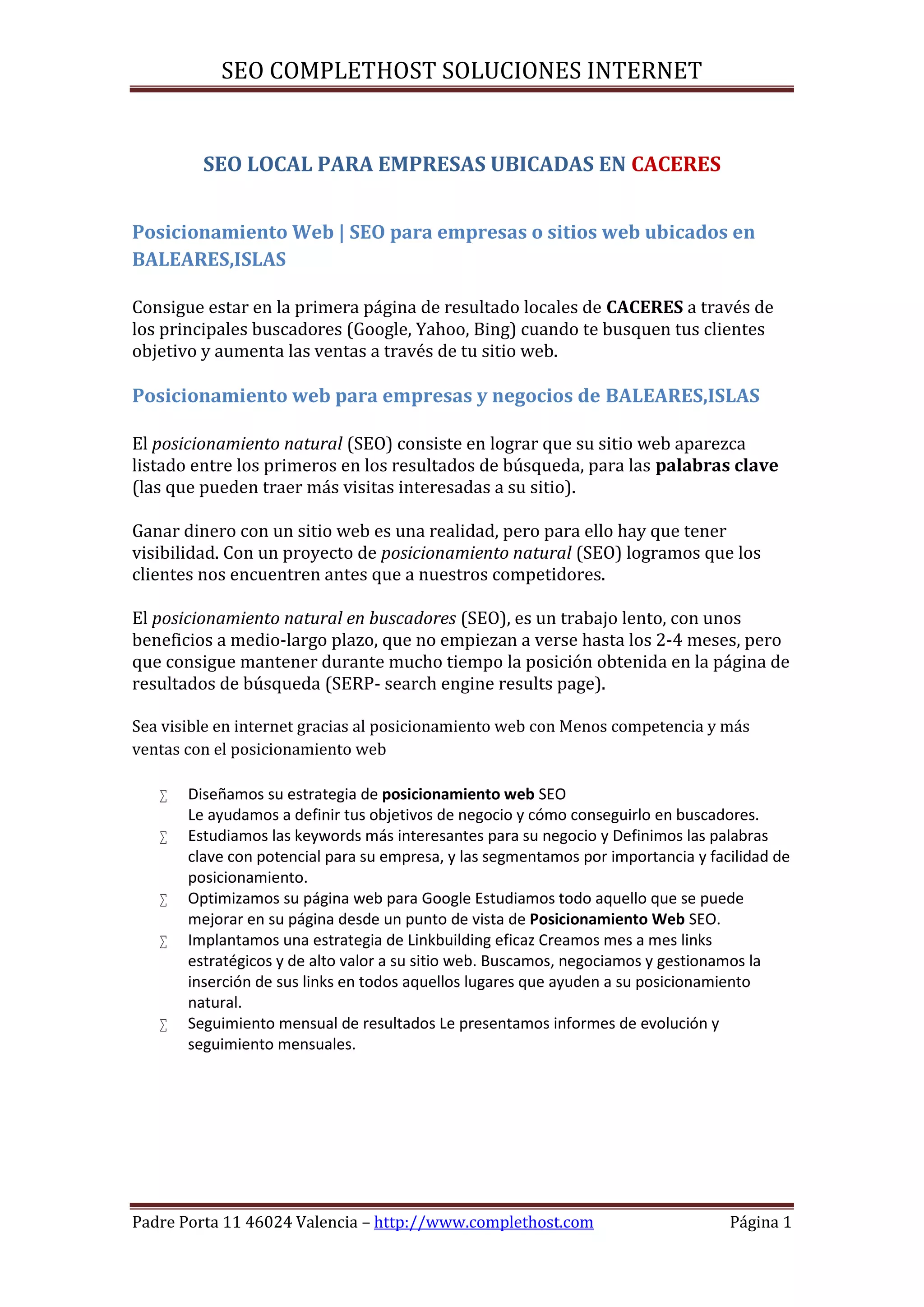 Este documento ofrece servicios de posicionamiento web (SEO) para empresas ubicadas en Cáceres, España. Explica que el SEO involucra optimizar el sitio web de una empresa para mejorar su posicionamiento orgánico en los principales motores de búsqueda como Google y aumentar las ventas. También describe los servicios de SEO que ofrece, como el desarrollo de una estrategia de posicionamiento, la optimización de contenido y enlaces, y el seguimiento mensual de resultados.