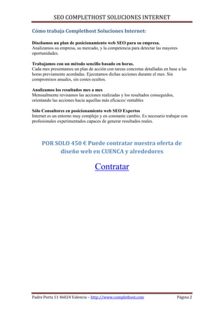Este documento ofrece servicios de posicionamiento web (SEO) para empresas ubicadas en Cuenca, España. Explica que el SEO involucra optimizar el sitio web de una empresa y crear enlaces de alta calidad para ayudar a la empresa a aparecer en los primeros resultados de búsqueda relacionados con su ubicación y palabras clave objetivo. El documento también describe el proceso de SEO de la compañía, que incluye el diseño de una estrategia SEO, el análisis de palabras clave y la competencia, la optimiz