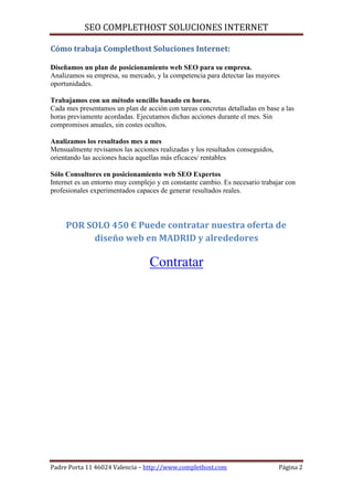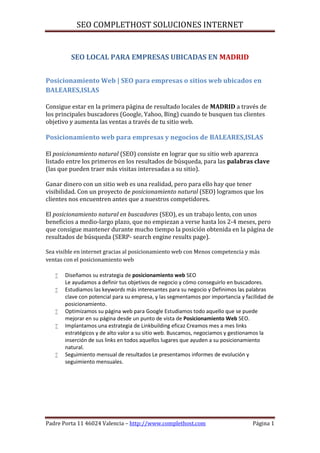 Este documento ofrece servicios de posicionamiento web (SEO) para empresas ubicadas en Madrid y Baleares. Explica que el SEO consiste en lograr que los sitios web aparezcan en los primeros resultados de búsqueda para palabras clave relevantes, lo que aumenta la visibilidad y las ventas. El SEO requiere de meses para ver resultados, pero puede mantener las posiciones durante mucho tiempo.