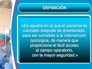 Este documento describe las posiciones quirúrgicas básicas como supina, prona, de Sims y de Fowler. Explica los objetivos de cada posición, como exponer el campo operatorio y minimizar el riesgo de lesiones. También detalla posibles complicaciones como daños nerviosos y describe variaciones de las posiciones como en Trendelenburg. Resalta la importancia de elegir la posición correcta para cada cirugía y monitorear al paciente para evitar traumas.