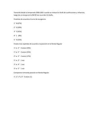 Este documento analiza los resultados de los 12 drafts de la NBA desde la temporada 2000-2001, mostrando que el 67% de los equipos escogidos en la primera posición han llegado a las finales, mientras que el 50% y 42% de los equipos escogidos en la segunda y tercera posición respectivamente también han llegado a las finales. Además, la serie más repetida en las finales ha sido entre el primero y segundo lugar de la ronda regular, ocurriendo en 4 de los 12 drafts.