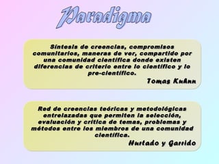 El documento describe diferentes paradigmas científicos como el positivista, socio-histórico y racional. El positivista se basa en la experiencia probada y sistematizada, orientándose al método empírico experimental. El socio-histórico comprende los procesos de interacción social desde la perspectiva de los actores. Y el racional evalúa las teorías por su refutabilidad y capacidad de someterse a prueba de manera crítica.