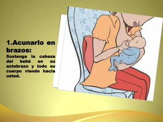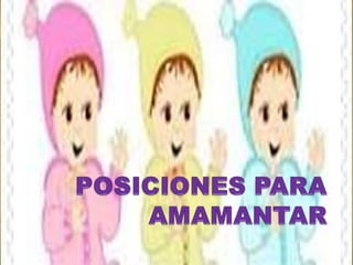 El documento describe cuatro posiciones para amamantar a un bebé: 1) acunarlo en brazos, 2) cruzada o de transición, 3) pelota de futbol americano, y 4) de medio lado. También proporciona consejos sobre cómo verificar que el bebé esté bien posicionado para lactar, como asegurarse de que los labios estén relajados y hacia afuera y la lengua debajo del pecho, y que no duela la lactancia.