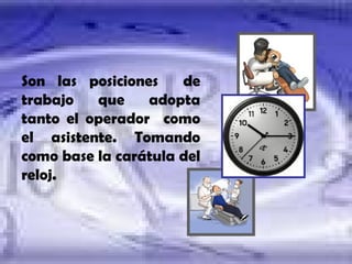 El documento describe las posiciones del reloj adoptadas por el operador y asistente dental durante los tratamientos, así como los requisitos ergonómicos para cada posición. El operador se ubica de las 9 a las 12 del reloj, mientras que el asistente se ubica de la 1 a las 3. Cada posición es adecuada para tratamientos específicos en diferentes cuadrantes dentales.