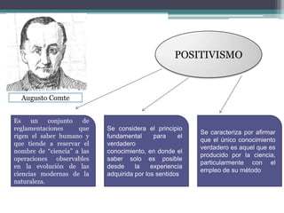 El positivismo es un conjunto de reglas que rige el saber humano y reserva el nombre de "ciencia" a las operaciones observables. Se caracteriza por afirmar que el único conocimiento verdadero es aquel producido por la ciencia mediante su método. Augusto Comte es considerado el fundador del positivismo y propuso la ley de los tres estados, donde el conocimiento pasa por estados teológico, metafísico y positivo. Existen corrientes positivistas extremadas y atenuadas.