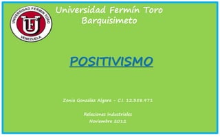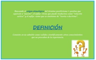 El documento define el positivismo como una doctrina que solo admite como válidos los conocimientos que proceden de la experiencia. Surge en el siglo XIX de la mano de Saint-Simón y Augusto Comte y se extiende por Europa. Existen dos corrientes: el positivismo extremado, que niega la existencia del derecho natural, y el positivismo atenuado, que lo admite como complemento al derecho positivo. Las características del positivismo incluyen el empirismo, descriptivismo, antimetafísico, relativismo, pragmatismo y