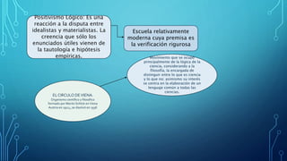 El documento describe el positivismo lógico, un movimiento filosófico que surgió en Viena en 1922. El Círculo de Viena, liderado por Moritz Schlick, promovió una filosofía basada estrictamente en la experiencia y la verificación empírica, rechazando la metafísica. El positivismo lógico buscaba establecer un lenguaje científico común y distinguir entre la ciencia y lo que no lo es según el criterio de verificación.
