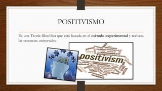 El positivismo, iniciado por Auguste Comte en el siglo XIX, es una teoría que sostiene que el único conocimiento auténtico es el científico basado en la experiencia, excluyendo otras formas de saber. Se manifiesta a través de figuras como Saint-Simon y John Stuart Mill, y continúa influyendo en el pensamiento contemporáneo. Por otro lado, el criticismo de Immanuel Kant critica el racionalismo y el empirismo, buscando establecer los límites y alcances del conocimiento humano.