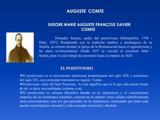 El documento trata sobre el positivismo y su principal exponente Auguste Comte. Explica que el positivismo es un sistema filosófico basado en la experiencia y el conocimiento empírico, rechazando los conocimientos a priori. Describe los tres estados del conocimiento humano según Comte y las características del positivismo y del Círculo de Viena.