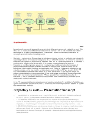 La postinversión comprende la operación y mantenimiento del proyecto así como la evaluación ex post. En la operación y mantenimiento, la entidad responsable debe asegurar que el proyecto cumpla con sus objetivos de mejorar la prestación de bienes y servicios públicos. La evaluación ex post evalúa en qué medida el proyecto generó los resultados esperados en comparación con lo planeado originalmente.