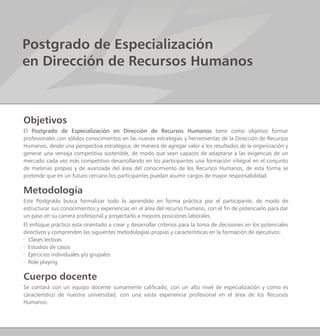 Este documento describe un postgrado de especialización en dirección de recursos humanos. El objetivo es formar profesionales con conocimientos estratégicos en gestión de personas para agregar valor a las organizaciones. La metodología incluye clases, estudios de casos, ejercicios y role playing. Se requiere titulo universitario o 3 años de experiencia, y al completar el programa se otorga un postgrado o diplomado. Las unidades cubren temas como planificación estratégica, gestión del cambio, evaluación de puestos y legislación