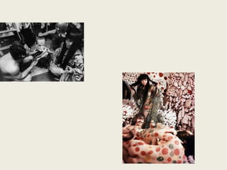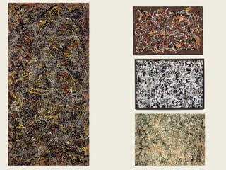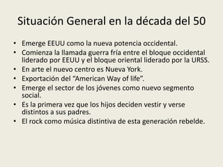 El documento describe la situación del arte y la moda luego de la Segunda Guerra Mundial. En el arte, surgió el expresionismo abstracto en Estados Unidos y el pop art en Gran Bretaña como reacción al consumismo. En la moda, Christian Dior lanzó el New Look y la minifalda se popularizó. En las décadas siguientes, surgieron nuevos movimientos artísticos como el minimalismo, el conceptualismo y el arte cinético, al tiempo que la moda experimentó con nuevos diseñadores y tendencias.