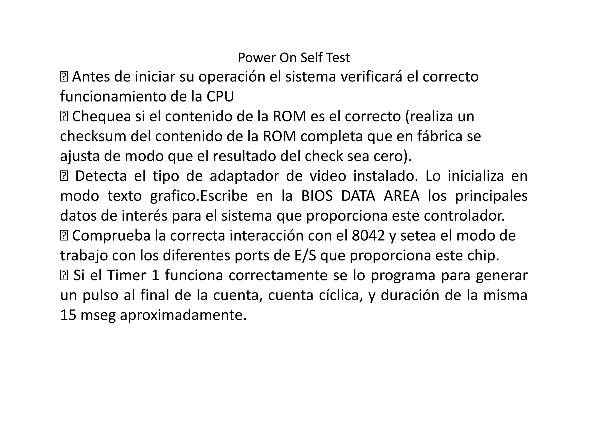 El POST comprueba el correcto funcionamiento de la CPU, la ROM, el controlador de video, el chip 8042, el timer 1, el canal DMA 0, el chip 8259, la memoria RAM, los timers y canales DMA restantes, el teclado, las unidades de disco, los puertos serie y paralelo, las extensiones BIOS y carga el sistema operativo si todo funciona correctamente.
