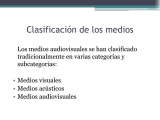Este documento clasifica los medios audiovisuales en tres categorías principales: medios visuales, medios acústicos y medios audiovisuales. Los medios visuales incluyen recursos como pizarras, transparencias y diapositivas que utilizan imágenes o texto. Los medios acústicos utilizan el sonido grabado en formatos como discos, casetes y archivos MP3. Finalmente, los medios audiovisuales integran tanto imágenes como sonido, como la televisión, el video y el cine.