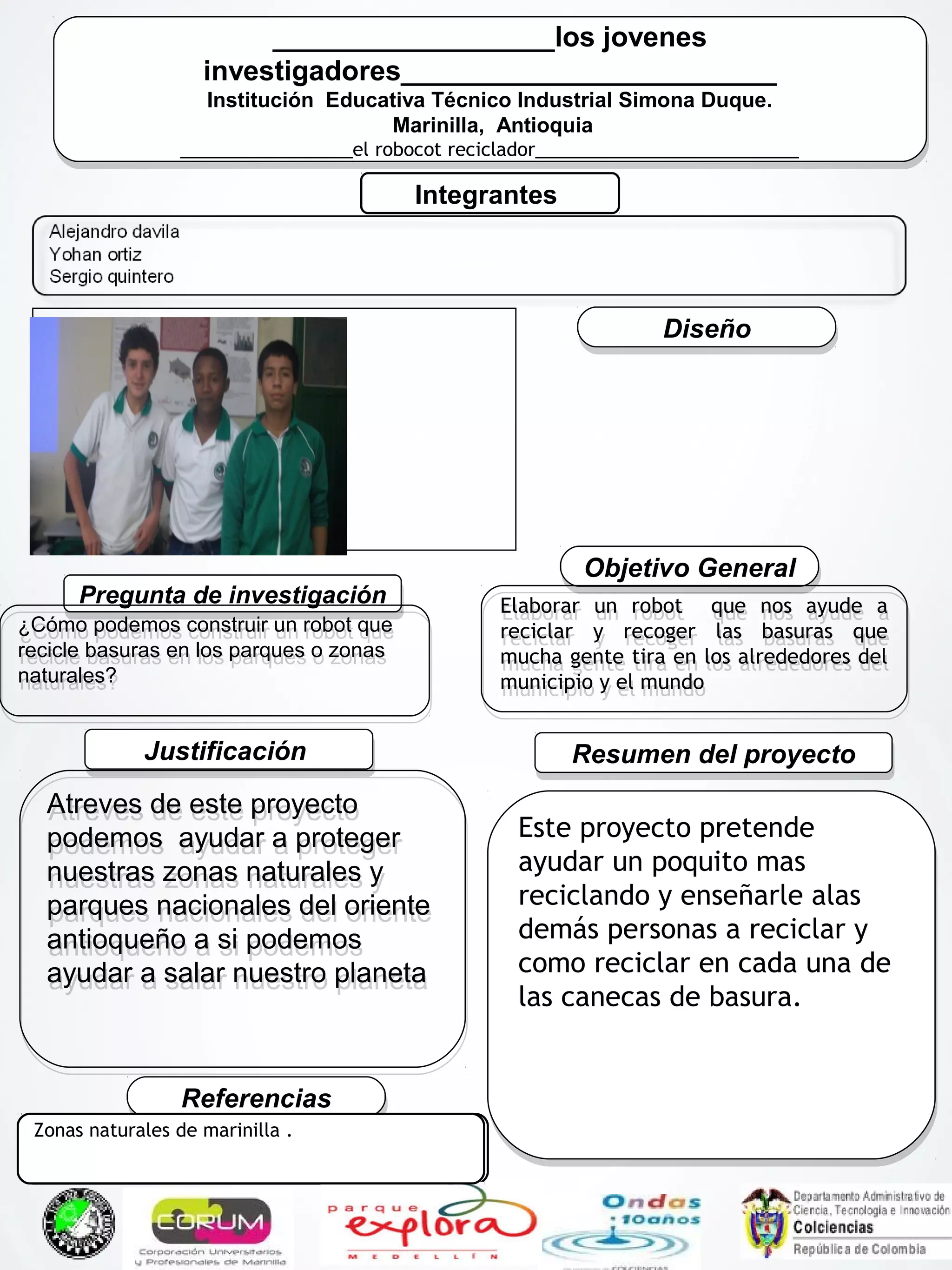 Este documento describe un proyecto de un grupo de estudiantes para construir un robot reciclador que recolecte basura en parques y zonas naturales con el objetivo de ayudar al medio ambiente y enseñar a las personas sobre la importancia del reciclaje.