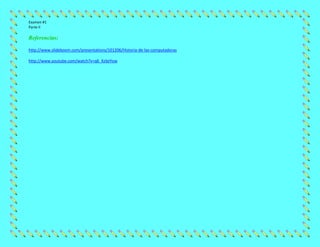 Este documento describe las principales partes de una computadora, incluyendo el CPU, monitor, teclado, bocinas o parlantes y mouse. Explica que el CPU es el cerebro de la computadora y procesa la información, el monitor muestra la información visualmente, el teclado se usa para ingresar datos, las bocinas reproducen audio y el mouse permite seleccionar y hacer clic en objetos en la pantalla.