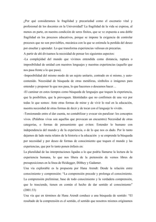 El documento presenta las reflexiones de dos docentes universitarios sobre los desafíos de educar en la universidad en un contexto de fragilidad y precariedad. Plantean la necesidad de pensar más allá de las lógicas instrumentales y de producción, y proponer formas de conocimiento que toquen las experiencias humanas. Buscan formas de comprender que les permitan estar en relación con los estudiantes y consigo mismos de manera significativa.